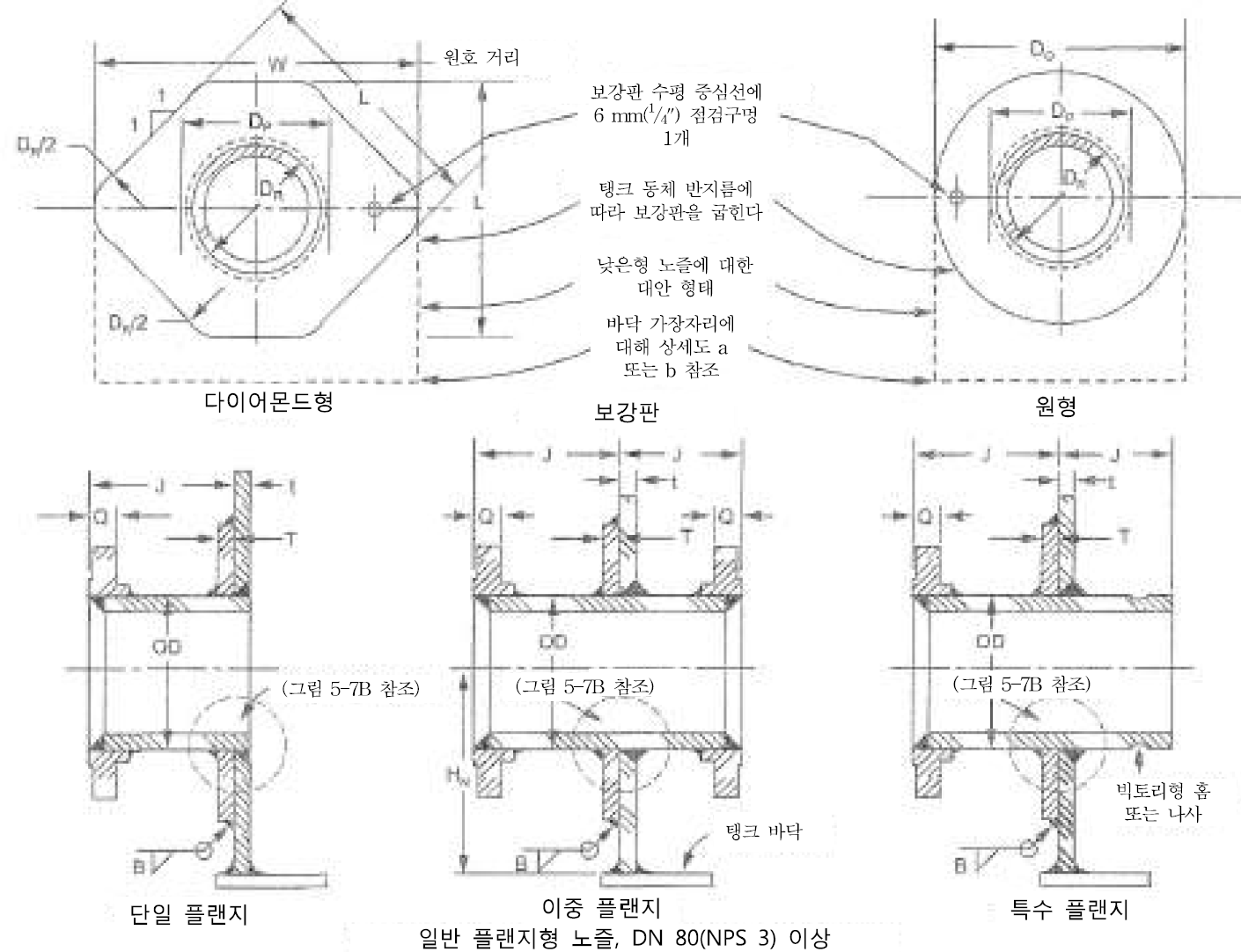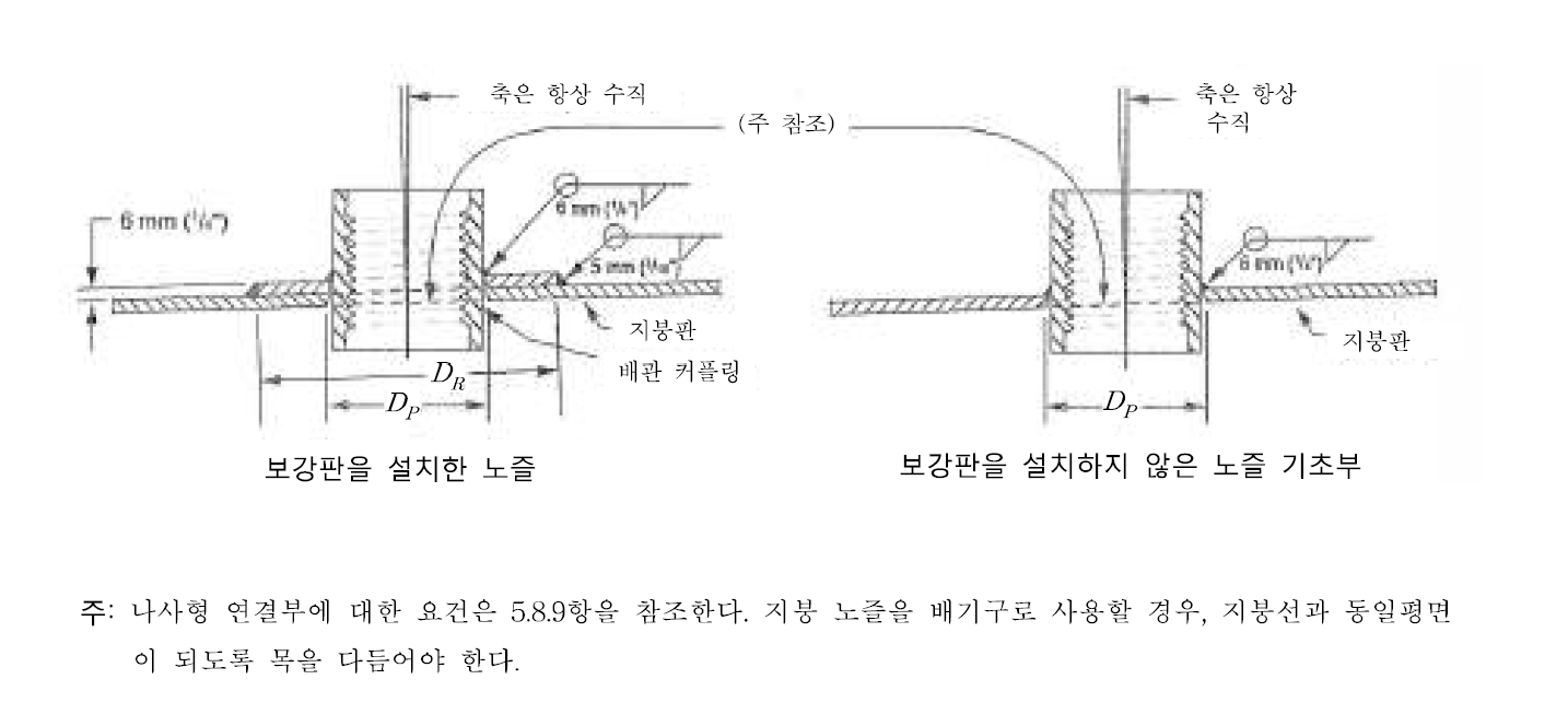 노즐의 용접 시 각 삽입구 보강은 하기에 따라 설치하여야 한다.